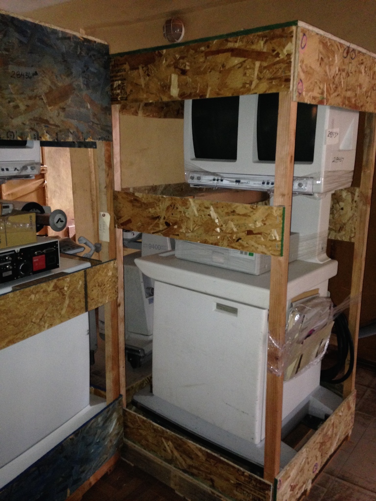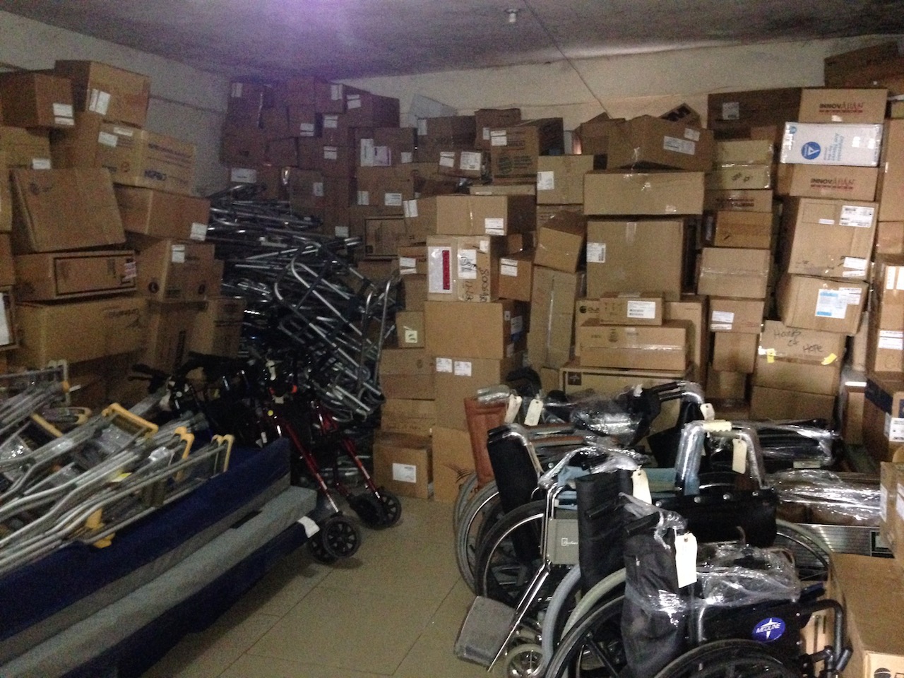 Many boxes, walking aides, few beds with mattresses, chairs and 2 scanning machines and 2 C-bow x-ray were off loaded.