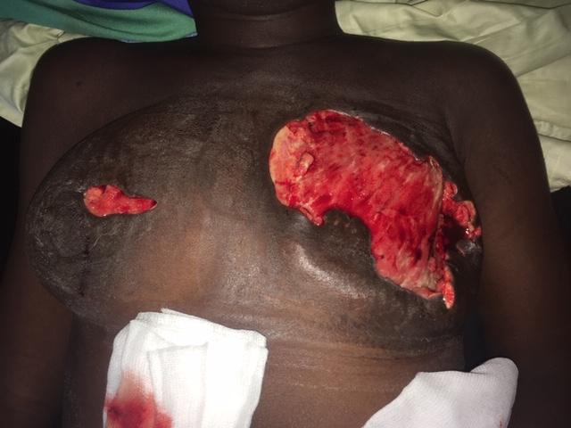 Traditional medicine was applied to her breast, but this made things only worse. When she arrived at City Garden Clinic her whole left breast was completely infected and necrotic, even a part of her other breast.